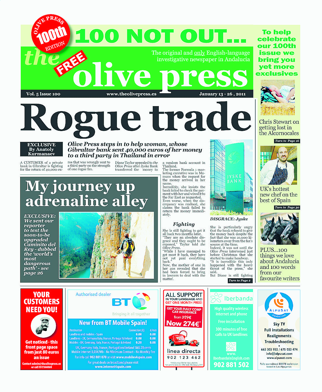 At the beginning of the year – in the Olive Press’ 100th issue – our front page story was of a woman’s fight against Jyske bank. The private bank in Gibraltar wrongly sent 40,000 euros of Diana Taylor’s money to a third party in Thailand on the strength of a rogue fax. Little did we know it would be one of several stories over the year of expats battling the banks, and we suspect quite a few more in 2012.