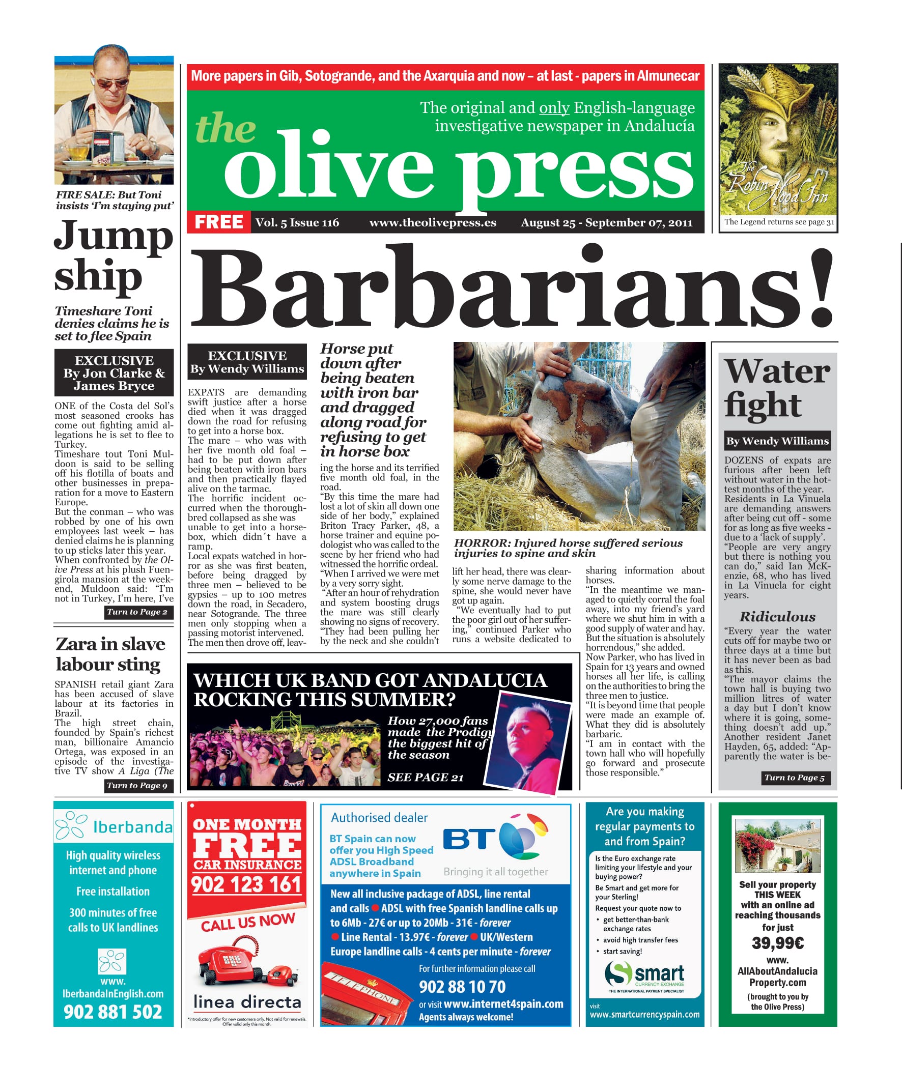Our main story in August was about a horse that had to be put down after being beaten with an iron bar and dragged along the road – in front of her five month old foal. The Olive Press was flooded from calls and comments from concerned readers demanding justice and inquiring to the health of the foal. The following issue we were able to report the foal had been given a new home and was doing well.