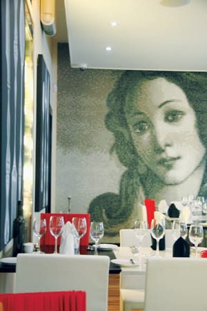 You walk into the restaurant via a copper tunnel and are then struck with a captivating image of Botticelli’s Venus at the far end.