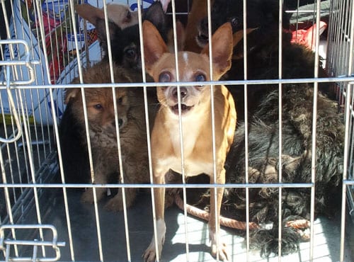 Animal rescuers were left horrified after finding 38 dogs – including pregnant females – living alongside the rotting corpses of eight dogs that had died up to two months earlier.