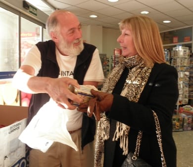 The couple handed out special bags to customers as they shopped to encourage them to donate, then helped coordinate the collection and loading the packets of lentils, pasta, tomate frito and long-life milk onto carts.