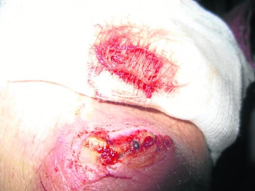 But after months of agonising pain the bone in his knee began to poke through the skin, leaving a gaping hole.