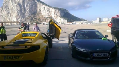 Presenters Jeremy Clarkson, Richard Hammond and James May have been spotted on the Rock as they prepare to test an Audi R8 against the McLaren Mp4-12c on the runway of Gibraltar International Airport.