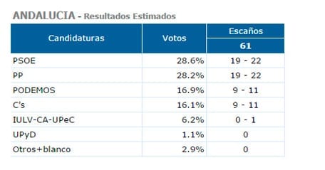 In Andalucia, the PSOE has acheived by far its worse showing 28.6% of the vote, with 19-22 seats, according to TNSÂ Demoscopia.