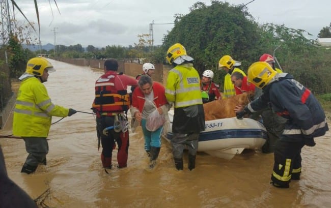 A woman is rescued by the Guardia Civil from her flooded home in Cartama