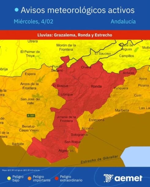 The alert is in place on the coast and some inland areas, including Alhuarin el Grande, until 7pm tonight, extended to 8pm in all other affected areas.