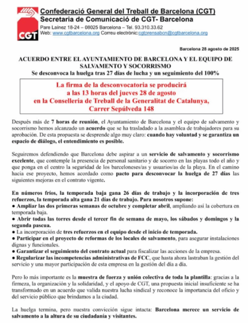 LIFEGUARDS in Barcelona will finally return to work following 27 days of strike action after the CGT trade union struck a deal with the city council to improve working conditions.