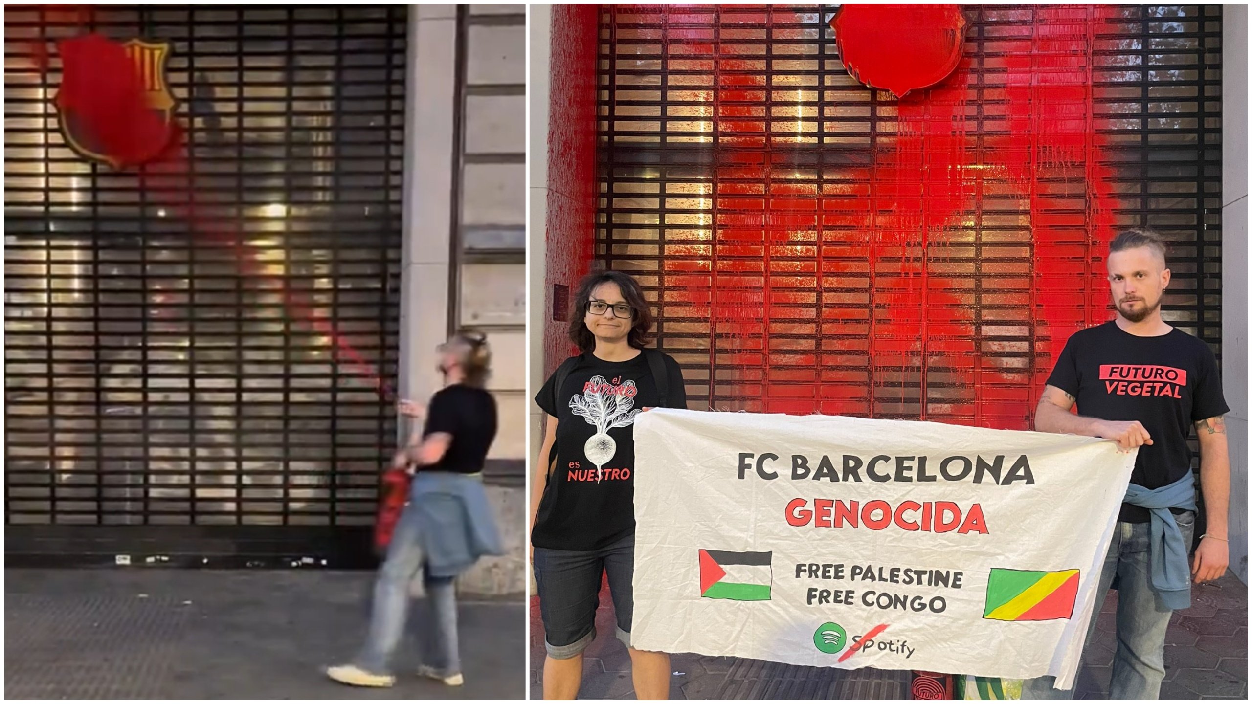 The pair of protesters smothered the front of the store in a thick layer of red colouring, before holding up a banner that read, โFC Barcelona Genocide. Free Palestine. Free Congoโ.