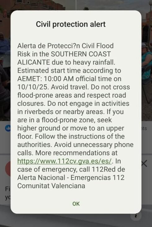 A warning has also been sent by the Valencian Emergencies Civil Protection Unit to mobile phones.