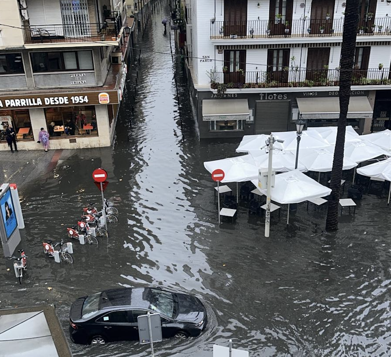 Elsewhere, Calle Alfonso XII, in the heart of the old city, was turned into a river as cars floated past shopfronts.