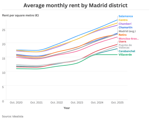 Figures from Idealista and Idilico Realty showed that rents in Puente de Vallecas, in south-west Madrid, averaged nearly €18,000 a year in October.
