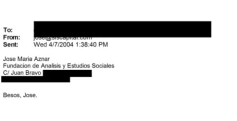 The email lists Aznar’s private address at the Fundacion de Analisis y Estudios Sociales (FAES), where he received the second package a month later, and is signed besos (‘kisses’). By that time, Aznar was no longer in office.