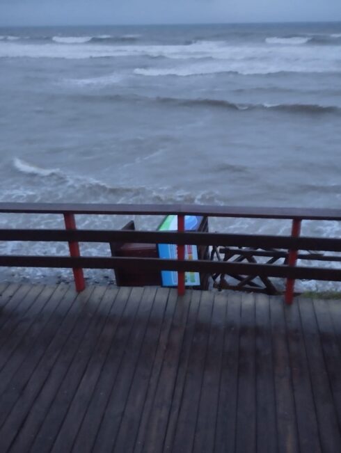 A lifeguard watchtower was ripped from its foundations and dragged into the sea by the violent surf.