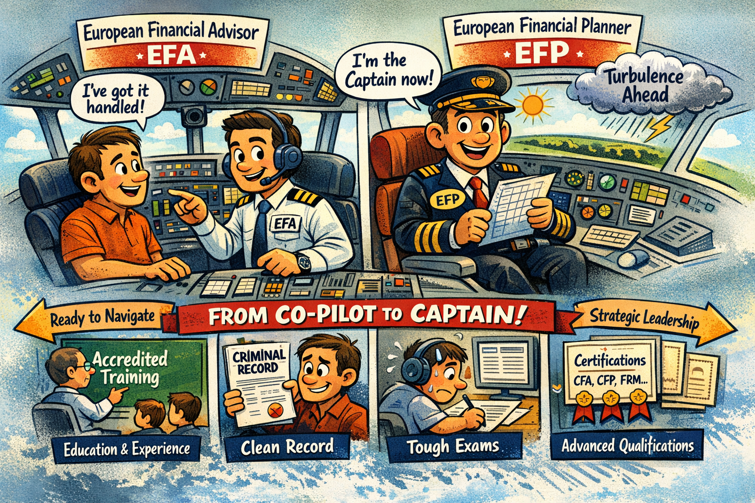 Instead, I tell the story from a client’s perspective and employ an airplane analogy: that a European Financial Advisor (EFA) is like a co-pilot who sits next to you and helps navigate day-to-day financial decisions safely and competently.