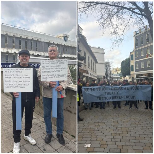 AS the dust starts to settle on Gibraltar’s long-awaited post-Brexit treaty, protestors gathered in the territory’s main square with placards branding it ‘treacherous’.