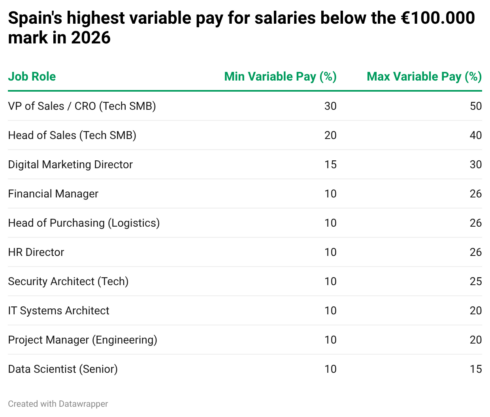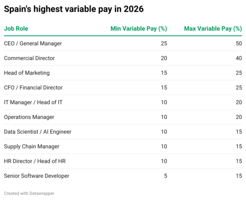 Spain’s highest variable pay for jobs below the €100,000 mark according to the 2026 Salary Guide by LHH Recruitment Solutions.