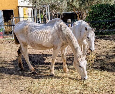 The pair were discovered with two other animals by La Linea Policia Local in a ‘flooded field without any access to food,’ according to the Andalucian Rescue Centre for Horses (ARCH).