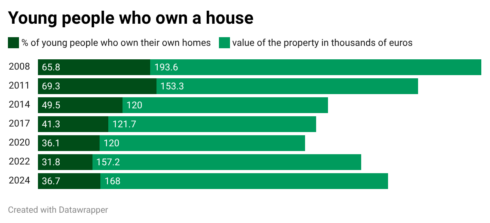 The average value of a primary residence for under-35s now stands at €168,000, slightly below the 2008 peak, but still far out of reach for many trying to save while paying high rents.